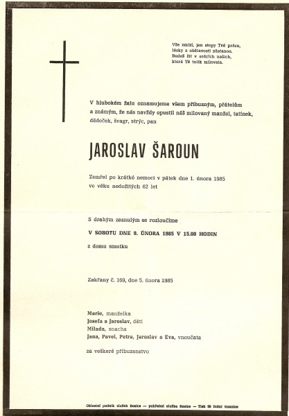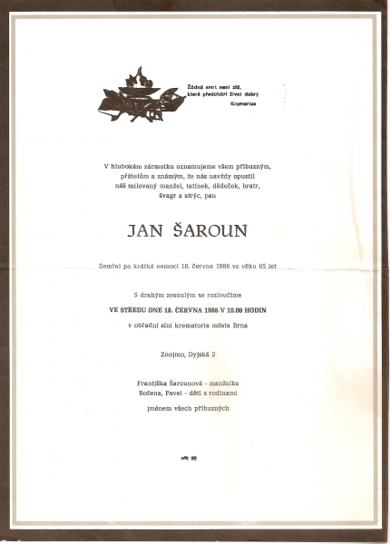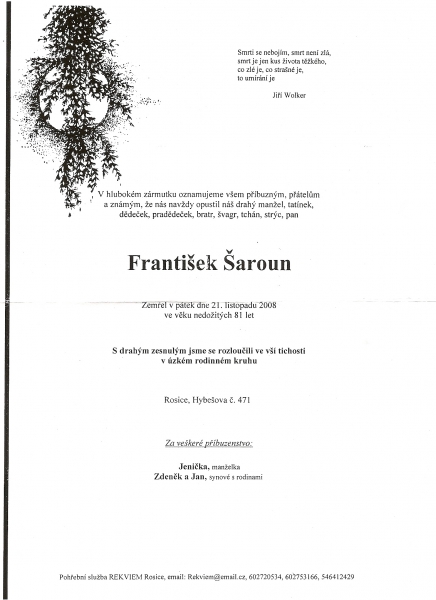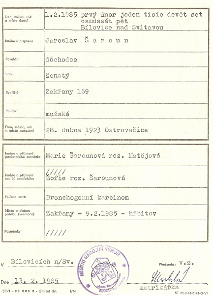 Úmrtní listy a oznámení:Osobní stránka na adrese: sarounovi.stranky1.cz